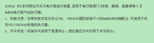 AIRTAC NTS系列限位开关为角行程只是装置,适用于角行程阀门(球阀、蝶阀、旋塞阀等)及NAMUR角行程气动执行器。